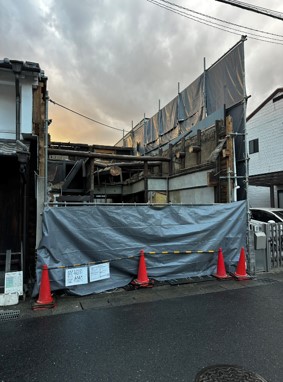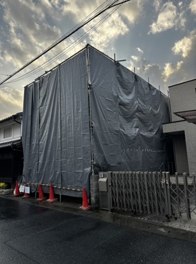 当初の予定では、解体後に隣の建物の壁を養生し、町屋などで見かける板金による修繕を行う予定でした。